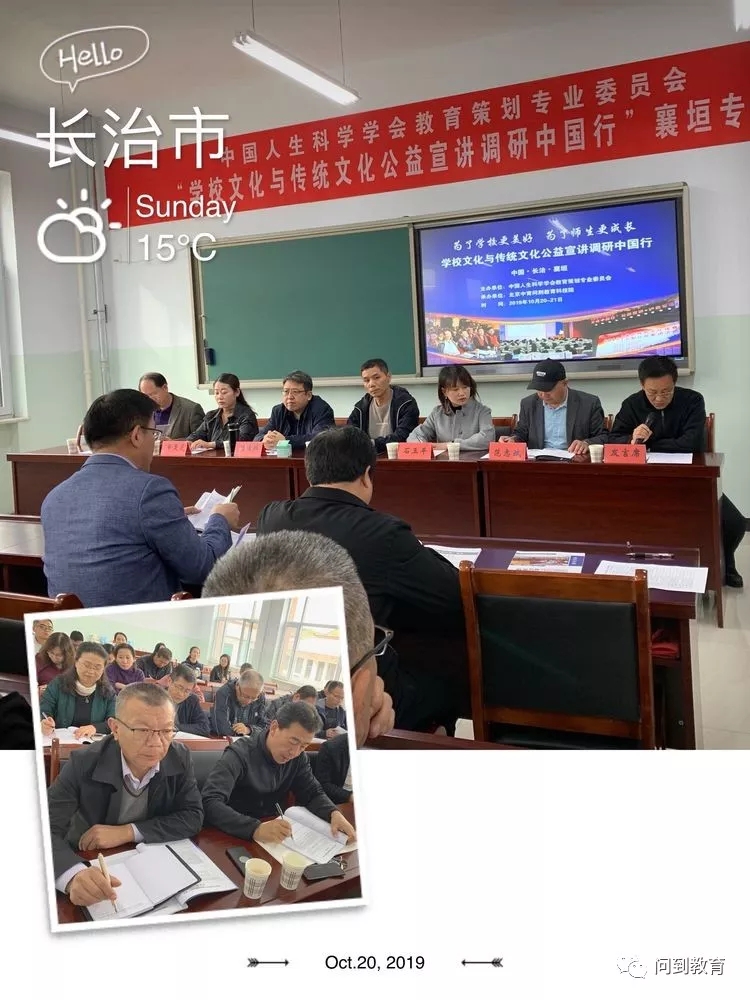 2019年10月20日、21日,中国人生科学学会教育策划专业委员会刘佳瑞会长、石玉萍主任、申灵芝主任等一行受山西省长治市襄垣县教科局邀请,到襄垣县进行学校文化调研及公益宣讲。