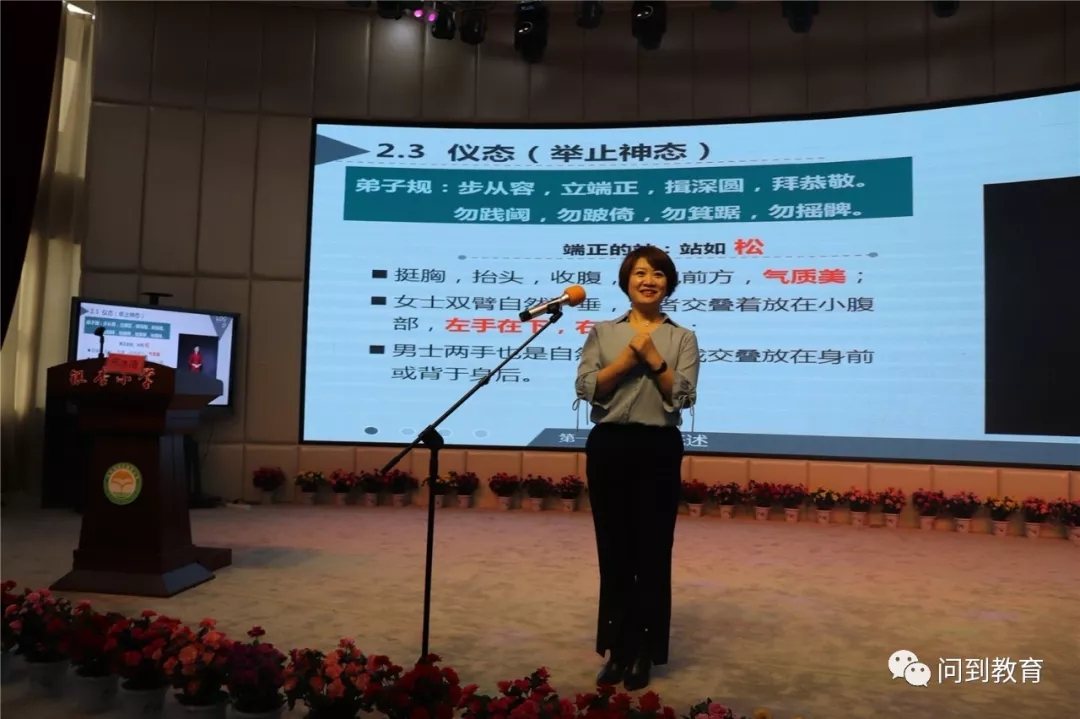 邢冰清,中国人生科学学会教育策划专业委员会培训部行为礼仪文化课程研发负责人,学校师生行为礼仪文化讲师。礼学文化是博大精深、内容丰富,冰清老师引经据典,通过图片视频为我们讲解了礼仪的重要性,以及孩子教养与家庭和学校的关系。下午冰清老师又从具体的仪容仪表仪态礼仪、接待礼仪、位次礼仪、鞠躬礼、语言礼等方面给老师们做了全面且透彻的讲解,并对礼仪核心——尊重与舒适进行了心理分析。
