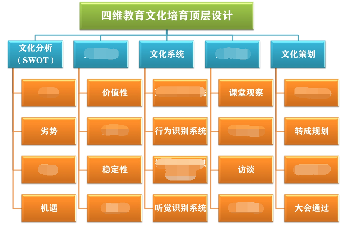 学校主题文化是统领学校宏观发展的战略体系。我校以“四维教育”为主题开展学校主题文化设计,进一步提升学校文化建设的品位,践行文化人本化的主张,坚持系统构建、精准凝练的原则,从文化分析、文化特点、文化系统(包括理念识别系统、行为识别系统、视觉识别系统、环境识别系统、听觉识别系统)文化评估、文化策划五个方面构建了凸显和融价值理念的四维文化,提高学校的内在品格,塑造学校的品牌形象。
