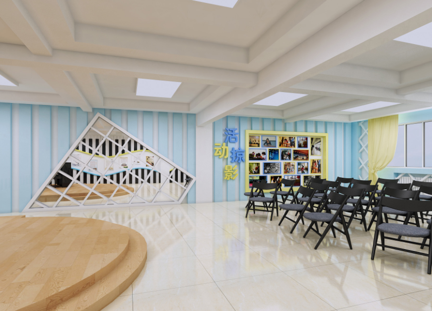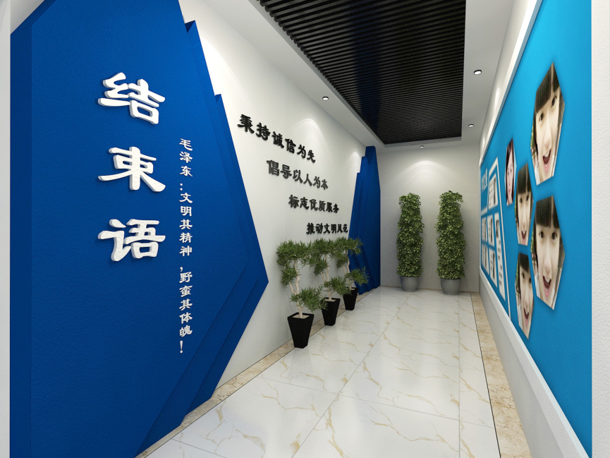 为了凸显“精致教育、精彩人生”的主题,实现与整个学校风格的统一,大厅的整体色调采用了蓝色,配以木质背景墙,呈现古典与现代化的碰撞。中间设计了一本书的造型,显得整体空间书香味格外的浓郁,并且透漏出一种清新大气。中间的柱子上设计了精彩之星的版块,使同学们有进一步努力、前进的目标,让更多的同学发现自己的闪光点、找到成长中的自信。