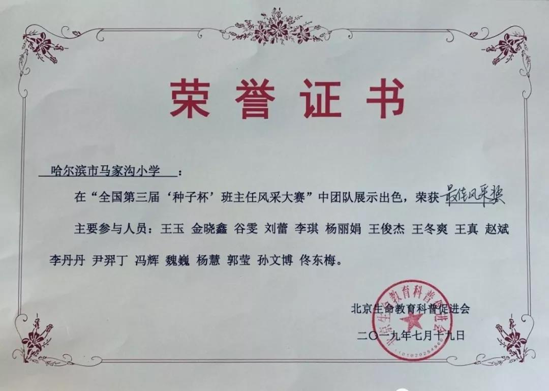 “东方瑞士”,班主任精英齐聚;夏日海滨,发现生命教育之美。2019年7月19日,全国第三届“种子杯”班主任风采大赛在山东省青岛市拉开帷幕。哈尔滨市马家沟小学“尊善智育”班主任工作室的16位教师在王玉校长的带领下尽展风采,在16个团队中脱颖而出,取得“最佳风采奖”的佳绩!