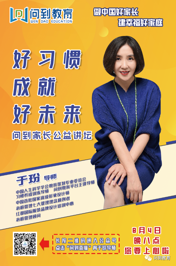 好习惯从行为训练开始,该如何培养孩子的好习惯,使他的学业和未来的事业都能井井有条呢?下周二(8月4日)晚八点,于玢导师将通过问到家长公益讲坛第15讲《好习惯成就好未来》为我们讲述。于玢导师是中国人生科学学会教育策划专业委员会习惯养成训练导师,问到教育平台主讲导师,中国首批国家高级形象设计师,衣橱管理七大管理理念原创者,红都国际服装品牌设计培训中心衣橱管理顾问。她对于衣橱管理有非常专业的见解,很多人听了她的课,都表示要回去重新整理衣柜,要更加热爱生活。