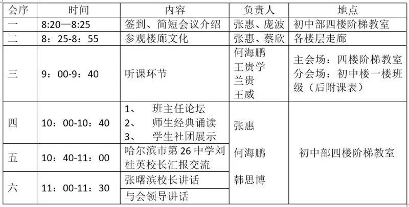 本次活动通过参观楼廊文化,听孝德讲堂、守正教育主题班会课、守正教育学科融渗课,班主任论坛、师生经典诵读、学生礼仪社团展示等形式向与会来宾展示二十六中开展守正教育工作带来的成效。活动由该校张惠副校长主持。