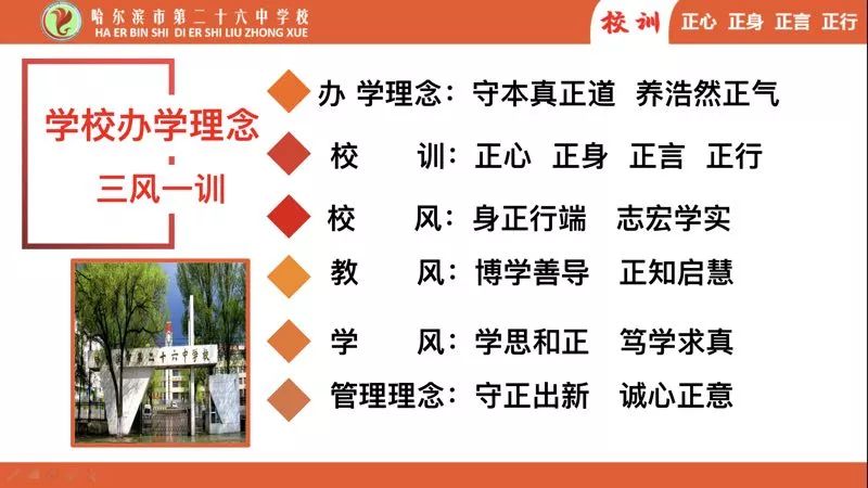 2017年在新一届领导班子的共同研究下,哈尔滨市第二十六中学确立了以守正教育为核心的育人理念,确立了“守本真正道,养浩然正气”的办学理念、“正心、正身、正言、正行”的校训,重视学生全面发展,注重学生思想品德教育,致力于打造彰显高尚道德、涵养浩然正气、践行本真正道为一体的传统文化特色学校,不断地提升学生的幸福感、教师的自豪感、家长的满足感。