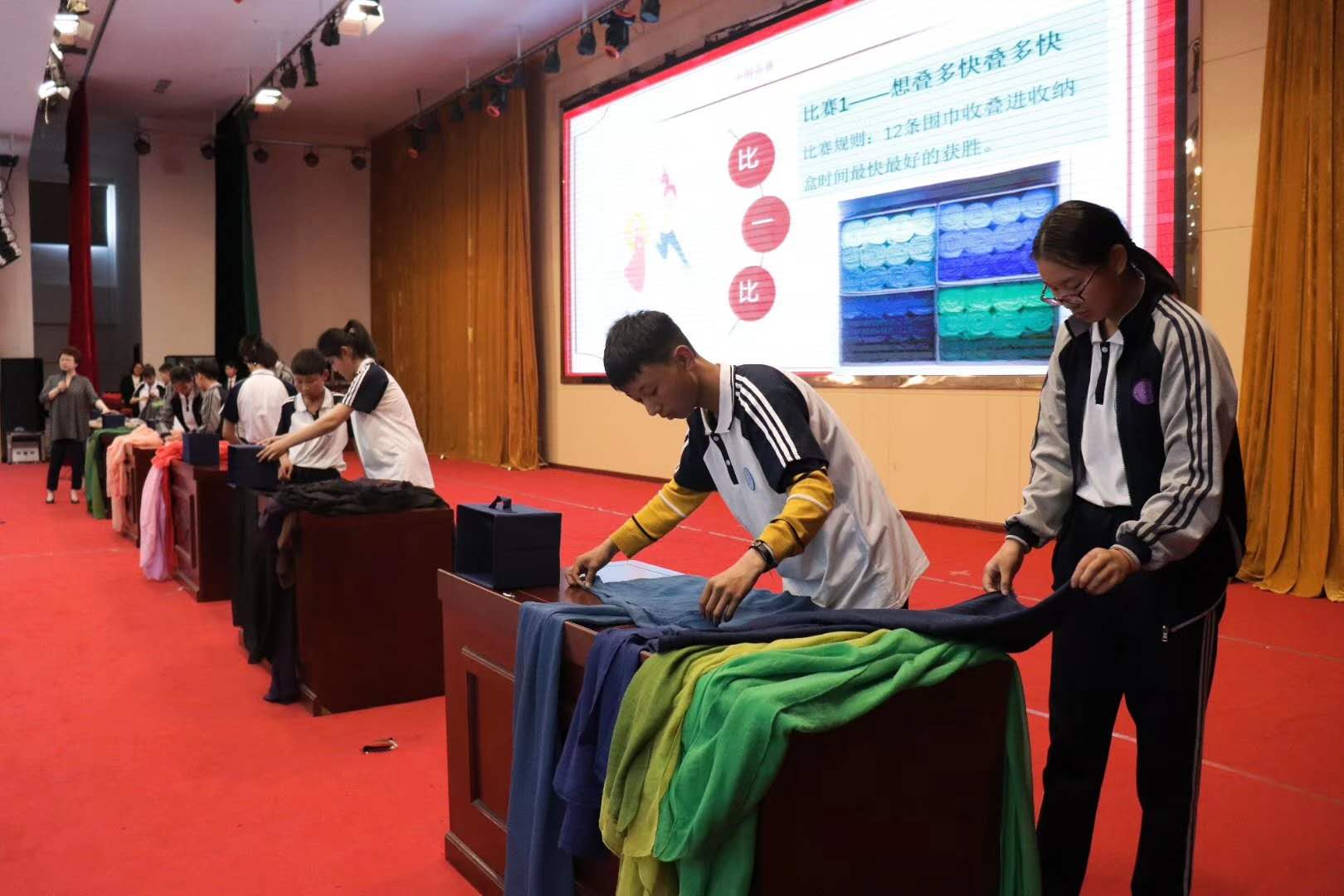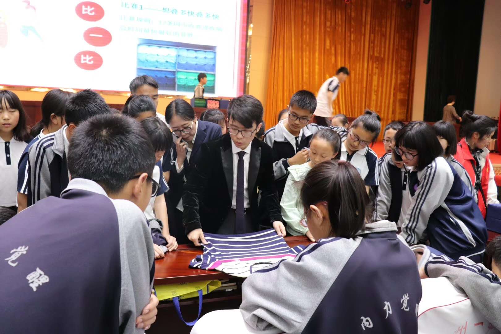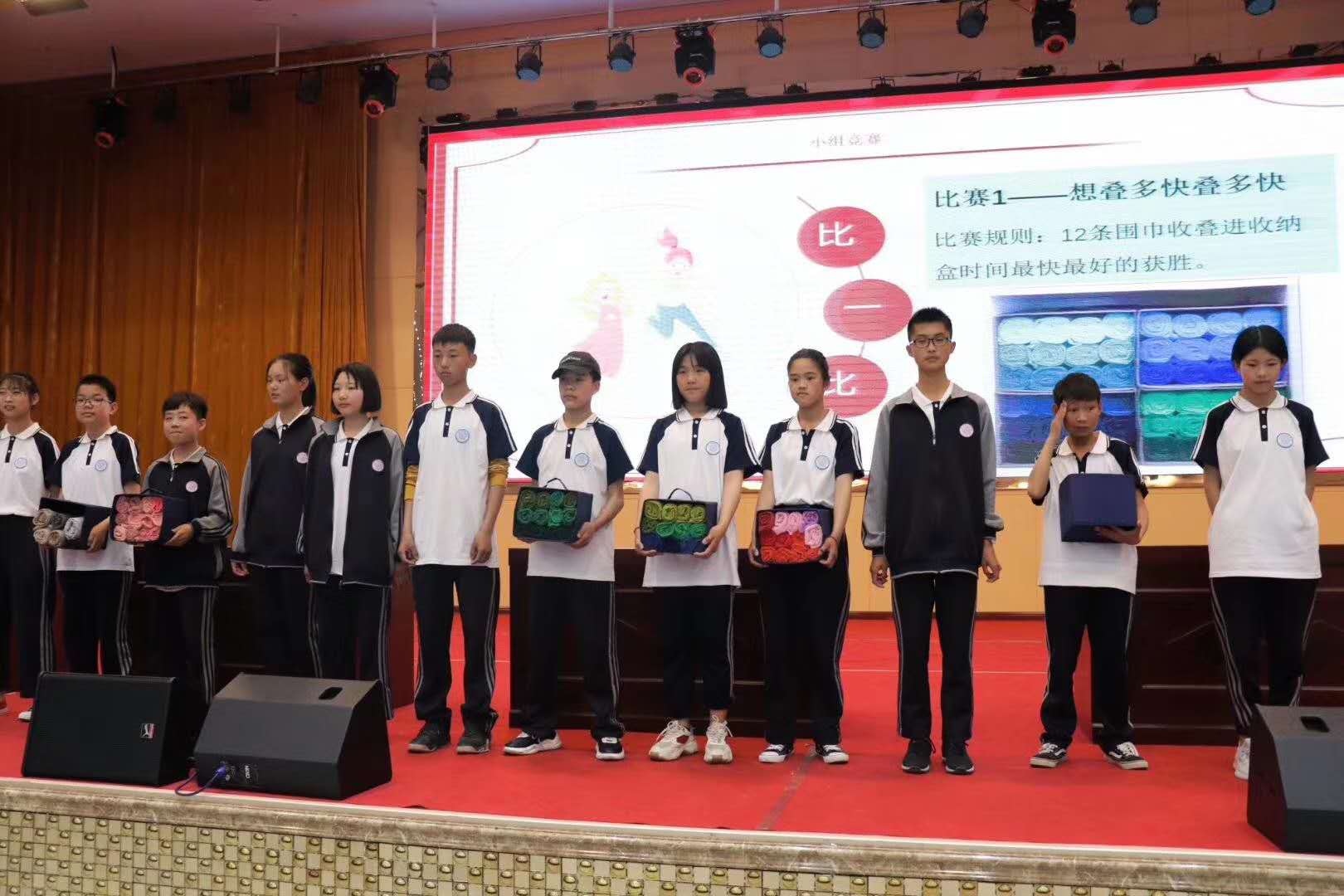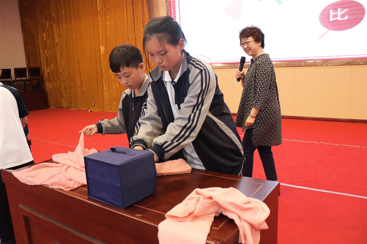 谭老师通过互动、竞赛等方式现场教学,亲身示范,让在座的每个人都学到了一种实用的收纳技巧——三三三快速整理法。孩子们从一开始的手忙脚乱到后来的井然有序,从低效到高效,我们亲眼见证了整理收纳的奇妙作用。收纳让我们的家更美好,让我们的思维更清晰,小小衣橱,蕴藏着大大的智慧。