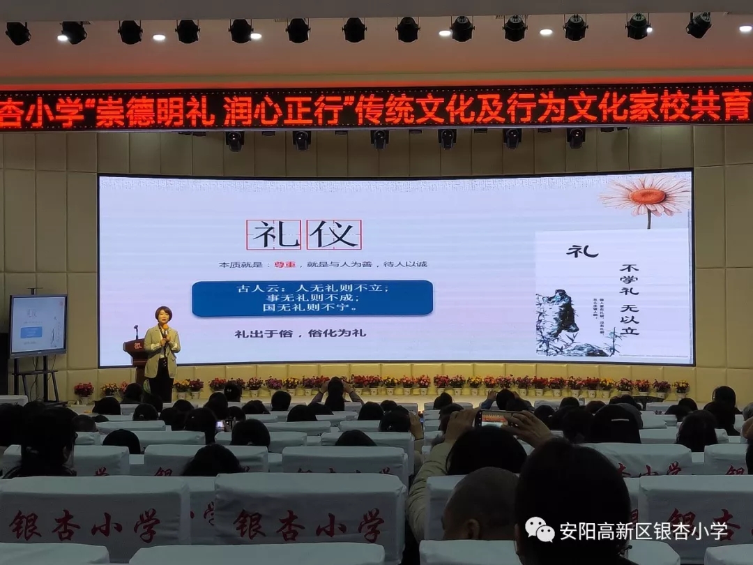 习近平总书记指出:“国无德不兴,人无德不立”。为了进一步带动学校师生弘扬社会主义核心价值观,全面落实“立德树人”“以文化人“,丰富和发展主题文化内涵,促进学校师生行为文化养成,11月15-18日,由中国人生科学学会教育策划专业委员会主办,安阳市文峰(高新)区银杏小学承办的“崇德尚礼 润心正行”学校传统文化及行为文化主题培训在银杏小学圆满落幕,此次会议共有300余人参加。一起来看详细内容↓↓↓