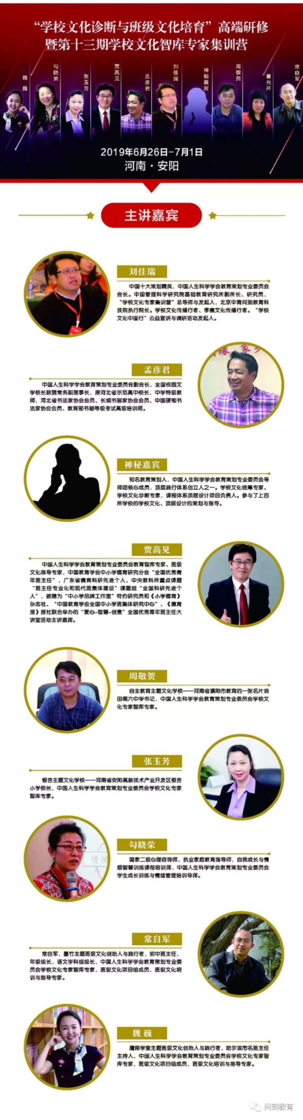 为贯彻落实全国教育大会精神和《教育部关于大力加强中小学校园文化建设的通知》,通过校风教风学风、多种形式的学校文化活动、人文和自然的学校环境等给学生潜移默化而深刻的影响,以鲜明正确的导向引导、鼓舞学生,以内在的力量凝聚、激励学生,以独特的氛围影响、规范学生,强化学校文化对学校师生的导向激励、约束调适和凝聚辐射功能,提升新时代新课程理念下的文化自觉和文化自信,促进学校常规管理到文化管理的快速转型,通过提升学校校长等领导的学校文化诊断水平,进而推动学校内涵发展,用文化的力量营造师生共生的班级文化空间,浸润师生行为,2019年6月26-7月1日,中国人生科学学会教育策划专业委员会将举办“学校文化诊断与班级文化培育”高端研修暨第十三期学校文化智库专家集训营。