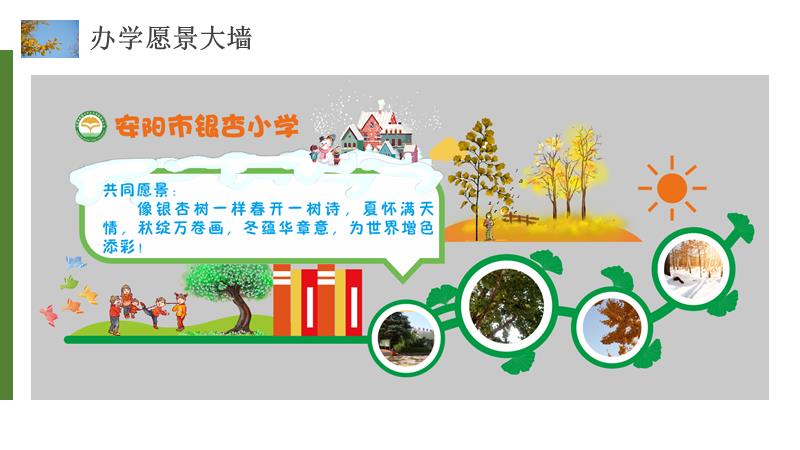 银杏,以春夏秋冬的典雅亮丽,以多姿多彩的高贵特质,点亮了自己的名字。其品质赋予了具有魅力的文化信息:因其远古长寿成为一种精神信仰;因其美轮美奂而成为一种园林景观;因其药用价值而成为一种功德之树;因其历经磨难顽强不屈而成为一种民族象征;因其大气磅礴而具有一种宽容的美德;因其被赋予文化内涵成为一种诗词歌赋的载体。银杏小学的主题文化——银杏文化凝练了银杏之品质,以立德树人为核心,明德践行,养德润行,弘德笃行,是一种追求卓越的信念,一种永在路上的攀登,一种大气磅礴的赞歌。我们欣喜地看到,在银杏主题文化引领下,银杏小学切切实实地践行着“春华秋实”这一办学理念。学生、教师、家长、学校在银杏教育主题文化的润泽下悄然发生着变化。银杏文化之根正在我校深深地扎下来,乃至于开枝散叶,活力向阳,硕果累累,每位师生像银杏树一样,春开一树诗,夏怀满天情,秋绽万卷画,冬蕴华章意,为世界增色添彩。