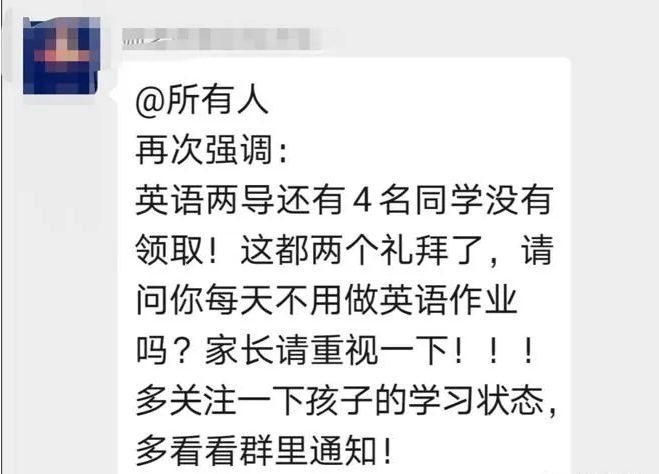 上周一我儿子的班主任通知各位家长,中午2点半准时到学校的门卫室拿英语练习册,但是一周过去了依然有4位家长还没去拿,今天老师再一次在微信群通知: