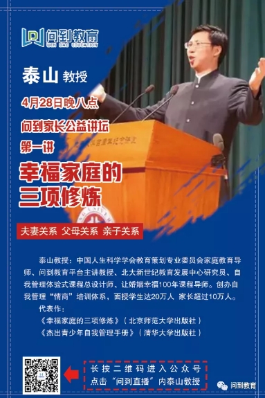 4月28日晚上8点,泰山老师给诸多的家庭带来全网独家首播《幸福家庭的三项修炼》的课程,从构建幸福家庭开始为孩子创造美好的成长底色。问到教育平台倾注力量开设的问到家长公益讲坛,将邀请更多的知名专家学者与践行导师,力求对家长的育人理念、沟通方法、情绪调控、亲子关系、习惯养成、学习方法等以提升!全年问到家长公益直播52讲,全部免费直播,总有一款适合家长,总有一些内容触动家长!每周一小时,让家庭教育变得简单,让育儿方法变得有效,让家长教育路上不再孤单,让学校的教育不再孤立。