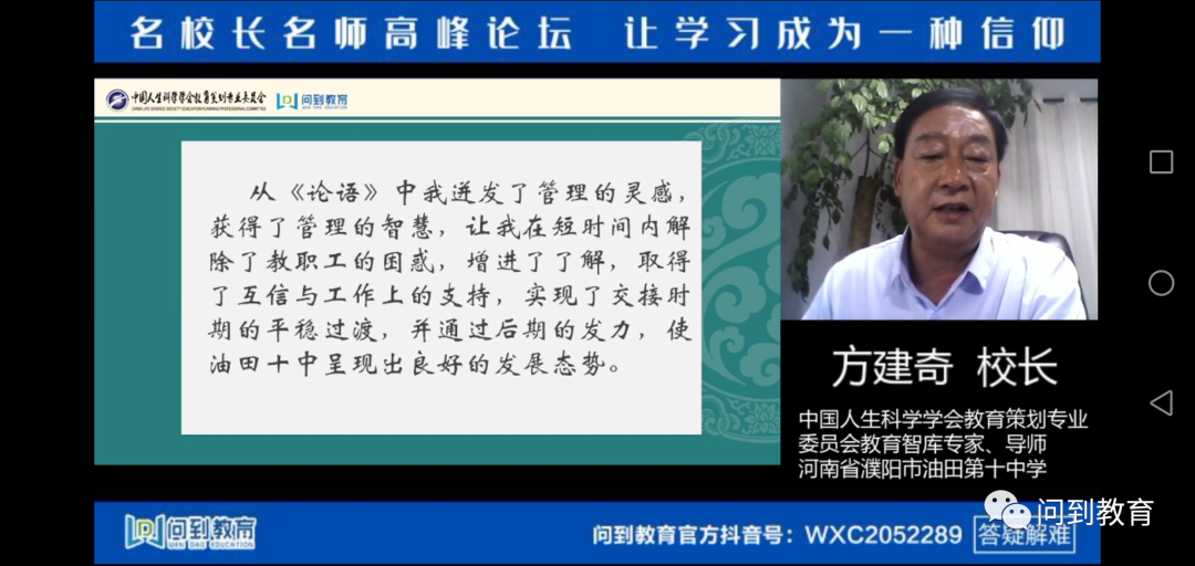 6月11日晚8点,中国人生科学学会教育策划专业委员会教育智库专家、导师,河南省濮阳市油田第十中学校长方建奇校长在问到直播讲述了《<论语>中校长管理之道》。